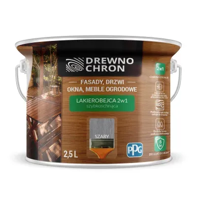 Drewnochron Lakierobejca 2w1 w kolorze szarym o pojemności 2,5l to produkt przeznaczony do dekoracyjno-ochronnego malowania drewna i materiałów drewnopochodnych. Dzięki formule 2w1 zapewnia trwałą ochronę przed czynnikami atmosferycznymi oraz eleganckie satynowe wykończenie, podkreślając naturalne usłojenie drewna.