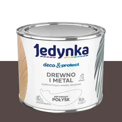 Emalia akrylowa Jedynka Deco&Protect brązowy ciemny satynowy połysk 0,2 l to szybkoschnąca, wodorozcieńczalna farba nawierzchniowa do dekoracyjno-ochronnego malowania powierzchni drewnianych, drewnopochodnych, zabezpieczonych antykorozyjnie elementów metalowych oraz tynków wewnętrznych w formie lamperii. Tworzy trwałą powłokę o satynowym połysku, odporną na działanie czynników atmosferycznych, przeznaczoną do stosowania wewnątrz i na zewnątrz budynków; mała pojemność 0,2 l dobrze sprawdza się przy renowacji detali i wykonywaniu zaprawek.