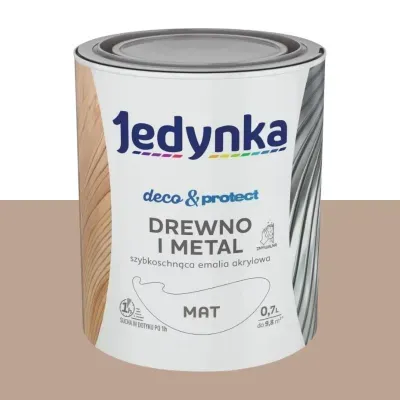 Emalia akrylowa Jedynka Deco&Protect brązowy mat 0,7 l to szybkoschnąca, wodorozcieńczalna farba nawierzchniowa przeznaczona do dekoracyjno-ochronnego malowania drewna, materiałów drewnopochodnych, zabezpieczonych antykorozyjnie elementów metalowych oraz tynków wewnętrznych w formie lamperii. Tworzy matową, zmywalną powłokę odporną na działanie czynników atmosferycznych, dzięki czemu może być stosowana zarówno wewnątrz, jak i na zewnątrz budynków.