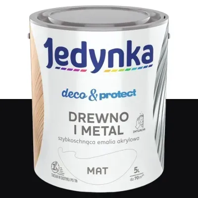 Emalia akrylowa Jedynka Deco&Protect czarny mat w wydajnym opakowaniu 5 l to wodorozcieńczalna farba nawierzchniowa do dekoracyjno-ochronnego malowania drewna i metalu wewnątrz i na zewnątrz budynków. Tworzy trwałą, dobrze kryjącą i zmywalną powłokę o eleganckim, matowym wykończeniu, która skutecznie poprawia odporność malowanych elementów na czynniki atmosferyczne oraz uszkodzenia wynikające z codziennej eksploatacji.