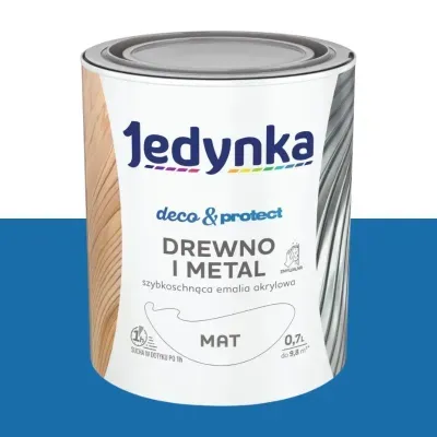 Emalia akrylowa Jedynka Deco&Protect niebieski ciemny mat w pojemności 0,7 l to wodorozcieńczalna farba nawierzchniowa przeznaczona do dekoracyjno-ochronnego malowania drewna i metalu wewnątrz i na zewnątrz budynków. Tworzy matową, trwałą i zmywalną powłokę o dobrym kryciu, skutecznie chroniącą podłoże przed codzienną eksploatacją i działaniem czynników atmosferycznych.