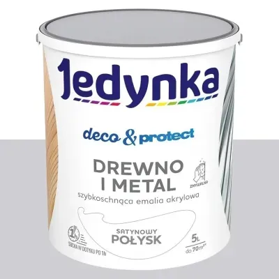 Emalia akrylowa Jedynka Deco&Protect szary jasny o satynowym połysku w pojemności 5 l to wodorozcieńczalna farba nawierzchniowa przeznaczona do dekoracyjno-ochronnego malowania drewna i metalu wewnątrz i na zewnątrz budynków. Duże, ekonomiczne opakowanie czyni z niej optymalne rozwiązanie do wykańczania rozległych powierzchni, na których tworzy trwałą, zmywalną powłokę o eleganckim wykończeniu, skutecznie zabezpieczającą podłoże przed codziennym zużyciem i czynnikami atmosferycznymi.