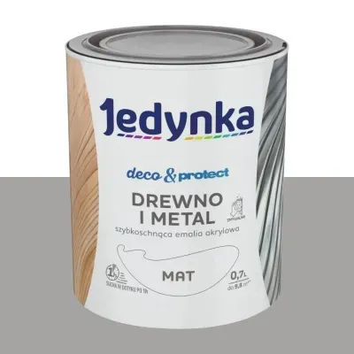 Emalia akrylowa Jedynka Deco&Protect szary mat w pojemności 0,7 l to wodorozcieńczalna farba nawierzchniowa do dekoracyjno-ochronnego malowania drewna i metalu wewnątrz i na zewnątrz budynków. Tworzy trwałą, zmywalną powłokę o matowym wykończeniu, która skutecznie kryje podłoże i zapewnia długotrwałą ochronę przed codziennym użytkowaniem oraz oddziaływaniem warunków atmosferycznych.