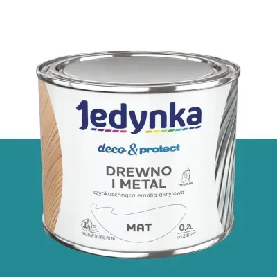 Emalia akrylowa Jedynka Deco&Protect turkusowy o matowym wykończeniu w pojemności 0,2 l to wodorozcieńczalna farba nawierzchniowa do dekoracyjno-ochronnego malowania drewna i metalu wewnątrz i na zewnątrz budynków. Tworzy trwałą, zmywalną powłokę, która dobrze kryje podłoże i poprawia odporność malowanych elementów na codzienne użytkowanie oraz czynniki atmosferyczne, ożywiając przestrzeń wyrazistym, turkusowym akcentem.