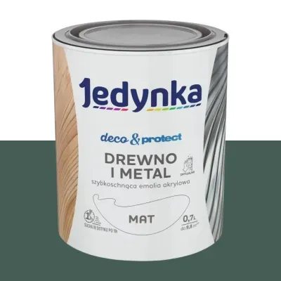 Emalia akrylowa Jedynka Deco&Protect zielony ciemny mat w pojemności 0,7 l to wodorozcieńczalna farba nawierzchniowa do dekoracyjno-ochronnego malowania drewna i metalu wewnątrz i na zewnątrz budynków. Tworzy trwałą, zmywalną powłokę o matowym wykończeniu, która zapewnia dobre krycie podłoża i skutecznie chroni malowane elementy przed codzienną eksploatacją oraz niszczącym wpływem warunków atmosferycznych, wzbogacając przestrzeń głębokim, ciemnozielonym kolorem.
