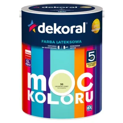 Farba Dekoral Moc Koloru jest farbą matową lateksową, która przeznaczona jest do dekoracyjnego malowania ścian i sufitów. Moc koloru / Akrylit W świetnie się rozprowadza i nie chlapie, posiada także doskonałe krycie oraz wysoką wydajność, co sprawia, że malowanie staje się prawdziwą przyjemnością. Powłoka farby Dekoral jest trwała i odporna na szorowanie, więc kolory nie blakną w czasie jednocześnie zachowując swoje piękno przez wiele lat.