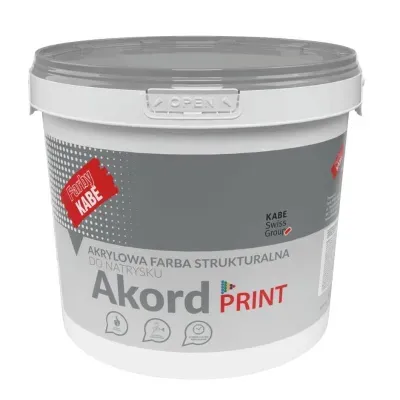 Farba strukturalna Kabe Akord Print 10l to wodorozcieńczalna farba do natrysku przeznaczona do wykonywania strukturalnych powłok malarskich wewnątrz budynków, szczególnie w pomieszczeniach mieszkalnych i użyteczności publicznej. Tworzy trwałą powłokę o przestrzennym wyglądzie i wysokiej odporności mechanicznej, umożliwiając uzyskanie faktury zbliżonej do tapety natryskowej lub klasycznego nakropka.