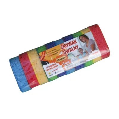 Gąbka do naczyń owalna 10szt. Czyścioszek to praktyczny zestaw kolorowych gąbek kuchennych o ergonomicznym, owalnym kształcie, zaprojektowany do skutecznego i higienicznego mycia naczyń oraz powierzchni roboczych. Każda gąbka posiada dwuwarstwową strukturę – miękką piankę poliuretanową, która doskonale się pieni i chłonie wodę, oraz warstwę szorstkiej fibry, przeznaczoną do usuwania trudnych zabrudzeń i przypaleń. Dzięki owalnej formie gąbki zapewniają pewny i wygodny chwyt, co znacząco ułatwia codzienną pracę w kuchni.