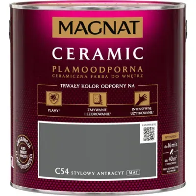 MAGNAT CERAMIC plamoodporna farba ceramiczna, stworzona na bazie najwyższej jakości żywic i pigmentów z myślą o najbardziej wymagających odbiorcach. Charaktertyzuje się ponadprzeciętną odpornością na szorowanie i wielkrotne zmywanie. Powłoki nie absorbują trudnych zabrudzeń oraz są odporne na środki dezynfekujące. Produkt zapewnia doskonałe krycie i wydajność, nie chlapie podczas malowania. MAGNAT Ceramic zapewnia trwałe kolory odporne nawet na intensywną eksploatację i "trudne" plamy, takie jak: ketchup, olej słonecznikowy, pisaki wodne, kredki, szminka, musztarda (usunąć do 1h), kawa, herbata, wino (usunąć do 15min).
