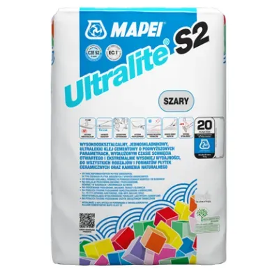 Mapei Ultralite S2 szary 15kg to jednoskładnikowy, wysokoelastyczny klej cementowy klasy C2TE S2, charakteryzujący się niską wagą oraz ekstremalnie wysoką wydajnością. Przeznaczony jest do montażu wszystkich typów i formatów płytek ceramicznych, kamienia naturalnego i gresu, szczególnie zalecany do wielkoformatowych oraz cienkich płytek gresowych i spieków kwarcowych. Dzięki technologii LowDust znacznie redukuje ilość pyłu podczas mieszania, a ultralekka formuła umożliwia uzyskanie tej samej wydajności co w przypadku tradycyjnych zapraw o większej masie. Klej jest łatwy w aplikacji, charakteryzuje się wydłużonym czasem otwartym, doskonałą przyczepnością oraz wysoką odkształcalnością.