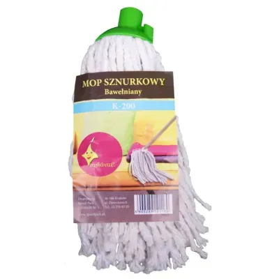 Mop sznurkowy bawełniany K-200 zapas Czyścioszek to klasyczna końcówka mopowa wysokiej jakości, przeznaczona do efektywnego mycia i czyszczenia wszystkich rodzajów podłóg. Wykonana ze 100% naturalnej bawełny, charakteryzuje się wysoką chłonnością i trwałością, co zapewnia skuteczne usuwanie zabrudzeń bez smug i zarysowań. Produkt doskonale sprawdza się w zastosowaniach domowych oraz profesjonalnych, np. w obiektach handlowych, gastronomicznych i biurowych.