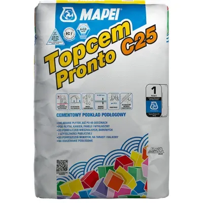 Mapei Topcem Pronto C25 25kg to gotowa do użycia posadzka cementowa klasy C25, przeznaczona do wykonywania szybkowiążących podkładów podłogowych na nowych oraz istniejących podłożach w budownictwie mieszkaniowym, użyteczności publicznej i przemysłowej. Zaprawa charakteryzuje się wysoką wytrzymałością końcową, normalnym czasem wiązania (zbliżonym do tradycyjnych cementów) oraz kontrolowanym skurczem — jest idealnym wyborem do podłóg o wysokich wymaganiach użytkowych i wszędzie tam, gdzie liczy się tempo prac oraz niezawodność. Wysoki współczynnik przewodzenia ciepła λ=2,0 W/mK sprawia, że produkt rekomendowany jest szczególnie do podkładów grzejnych, np. na ogrzewanie podłogowe.