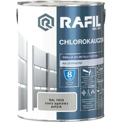 Emalia Rafil chlorokauczuk to produkt przeznaczony do malowania dekoracyjno-ochronnego elementów oraz powierzchni żeliwnych i stalowych, które są użytkowane na zewnątrz pomieszczeń. Można nią malować także wszelkie podłoża betonowe jak i tynki cementowo-wapienne. Farba Rafil tworzy elastyczną i zarazem trwałą powłokę, odporną na uderzenia, zarysowania czy wszelkie uszkodzenia mechaniczne. Ponadto, charakteryzuje się również zwiększoną odpornością na działanie trudnych warunków atmosferycznych. Produkt ten charakteryzuje się długotrwałą ochroną antykorozyjną powierzchni metalowych, a najlepszy efekt uzyskamy w połączeniu z podkładem chlorokauczukowym Rafil. Podłoża betonowe nie wymagają dodatkowo nakładania podkładu przed malowaniem emalią.