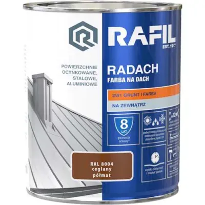 RAFIL RADACH FARBA NA DACH to gruntoemalia wysokiej jakości, która jest przeznaczona do ochronnego i dekoracyjnego malowania powierzchni metalowych, znajdujących się na zewnątrz. Z powodzeniem można nią zatem malować dachy, rynny, parapety i ogrodzenia. Nadaje się do malowania nie tylko nowych elementów, ale również do powierzchni, które wymagają renowacji. Cechą charakterystyczną farby Rafil jest jej doskonała przyczepność do podłoża. Farba jest szybkoschnaca, a malowane powłoki pozostają odporne na warunki atmosferyczne przez lata. Stosując farbę na dach Rafil Radach zapewnisz długotrwały efekt malowanych elementów lub całych powierzchni. Dodatkowo, aby zapewnich ochrone przed korozją można stosować w połączeniu podkład antykorozyjny Rafil.