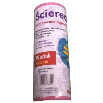 Ścierka perforowana Czyścioszek doskonale sprawdza się w codziennym sprzątaniu i utrzymaniu higieny. Dzięki chłonnej strukturze materiału błyskawicznie wchłania wodę, tłuszcz i inne zabrudzenia. Może być stosowana do wycierania blatów, armatury, sprzętów kuchennych, naczyń czy powierzchni roboczych. Perforowana forma rolki umożliwia wygodne dozowanie potrzebnej długości w zależności od zadania. Ściereczki są wielorazowego użytku — można je przepłukać, wysuszyć i ponownie wykorzystać, co czyni je ekonomicznym i ekologicznym wyborem dla każdego gospodarstwa domowego.