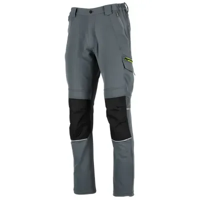 Spodnie robocze Stinger Stalco w rozmiarze L i kolorze szarym stanowią wytrzymałą i wygodną odzież do pracy, bazującą na trekkingowym kroju. Wykonane są z elastycznego materiału softshell, rozciągającego się w czterech kierunkach. Potrójne szwy, wzmocnione ryglami, gwarantują trwałość, a nogawki zakończone są gumką ze stoperem, umożliwiającą zamknięcie nogawek na bucie. Spodnie posiadają praktyczne kieszenie – po bokach na narzędzia, zapinane na zamek oraz kieszenie na kolanach na piankowe wkładki z wytrzymałego oxfordu. Wentylacja zapewniona przez tylne zamki z siateczką, a odblaski na nogawkach poprawiają bezpieczeństwo użytkownika.