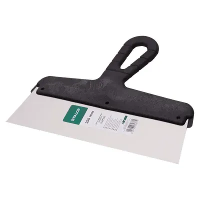Szpachla fasadowa do gipsu Stalco S-37725 to uniwersalne narzędzie idealne do nakładania i wyrównywania mas gipsowych na zewnętrznych i wewnętrznych powierzchniach budynków. Wykonana jest z wytrzymałej stali węglowej, co zapewnia jej elastyczność i odporność na pękanie. Uchwyt z tworzywa sztucznego jest ergonomiczny i zapewnia komfortowe trzymanie oraz łatwe manewrowanie szpachlą na nierównych podłożach.