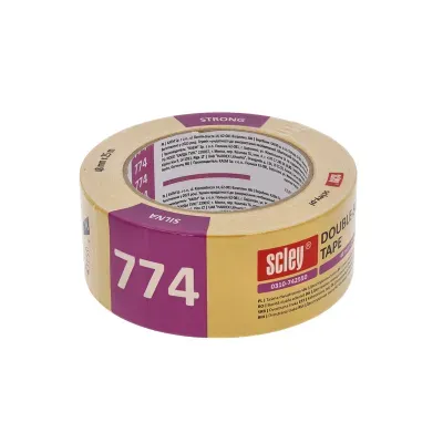 Taśma dwustronna podłogowa Scley *774* wykonana jest z grubej i wytrzymałej tkaniny o bardzo dużej sile klejenia. Taśma dwustronna jest idealna do łączenia chropowatych powierzchni, takich jak wykładziny z nierówną powierzchnią posadzki betonowej. Dodatkowa przekładka ułatwia precyzyjne naklejenie taśmy.
