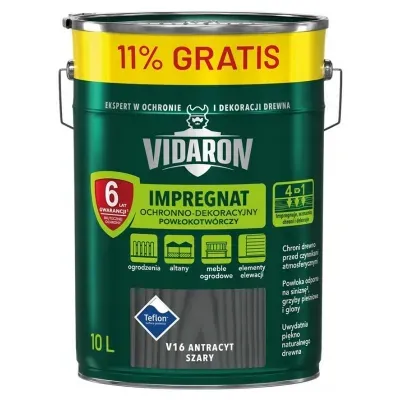 Vidaron Impregnat powłokotwórczy w kolorze antracyt w puszcze 9l+11% gratis to preparat przeznaczony do ochrony i dekoracji drewna zarówno na zewnątrz, jak i wewnątrz pomieszczeń. Dzięki formule wzbogaconej o Teflon™ surface protector, produkt zapewnia skuteczną ochronę przed wilgocią, promieniowaniem UV oraz biokorozją (sinizną, grzybami pleśniowymi, glonami). Tworzy trwałą powłokę o matowym wykończeniu, która podkreśla naturalny rysunek słojów drewna.