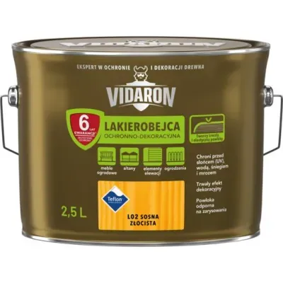 Wysokiej jakości Lakierobejca Ochronno-Dekoracyjna Vidaron tworzy na drewnie trwałą i elastyczną powłokę odporną na ścieranie. Lakierobejca skutecznie zabezpiecza drewno przed działaniem słońca (UV),wody, śniegu i mrozu jednocześnie zachowując naturalny rysunek słojów drewna.