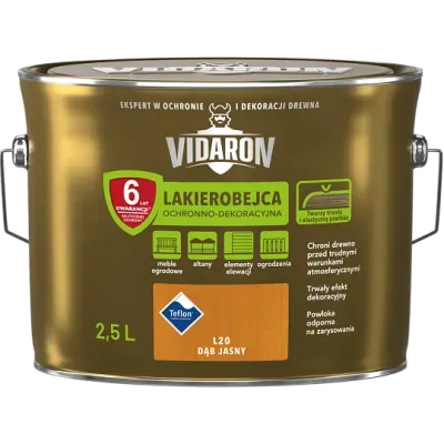 Wysokiej jakości Lakierobejca Ochronno-Dekoracyjna Vidaron tworzy na drewnie trwałą i elastyczną powłokę odporną na ścieranie. Lakierobejca skutecznie zabezpiecza drewno przed działaniem słońca (UV),wody, śniegu i mrozu jednocześnie zachowując naturalny rysunek słojów drewna.