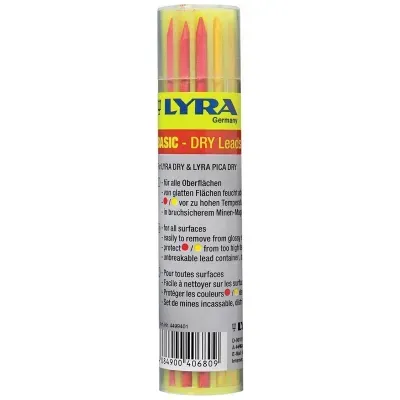 Wkłady wymienne do ołówka automatycznego LYRA DRY BASIC to zestaw 12 sztuk wkładów w kolorach: 6 x grafitowy, 3 x czerwony, 3 x żółty. Przeznaczone są do znakowania różnych powierzchni.