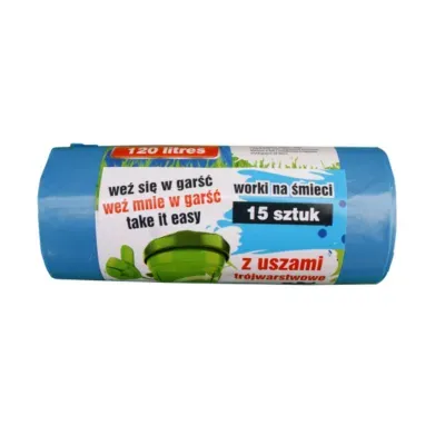 Worki na śmieci 120l z uszami niebieskie 15szt. Czyścioszek to wytrzymałe i funkcjonalne worki wykonane z grubej folii LDPE, idealne do codziennego użytku domowego oraz profesjonalnego. Dzięki praktycznym uchwytom – tzw. „uszom” – można je łatwo zawiązać, zamknąć i przenieść bez obaw o wysypanie zawartości. Ich niebieski kolor umożliwia łatwą identyfikację podczas segregacji odpadów papierowych i recyklingowych. Worki charakteryzują się odpornością na rozdarcia, przetarcia i wilgoć, co zapewnia bezpieczeństwo podczas użytkowania. Pojemność 120 litrów czyni je odpowiednimi do dużych koszy i pojemników na śmieci.